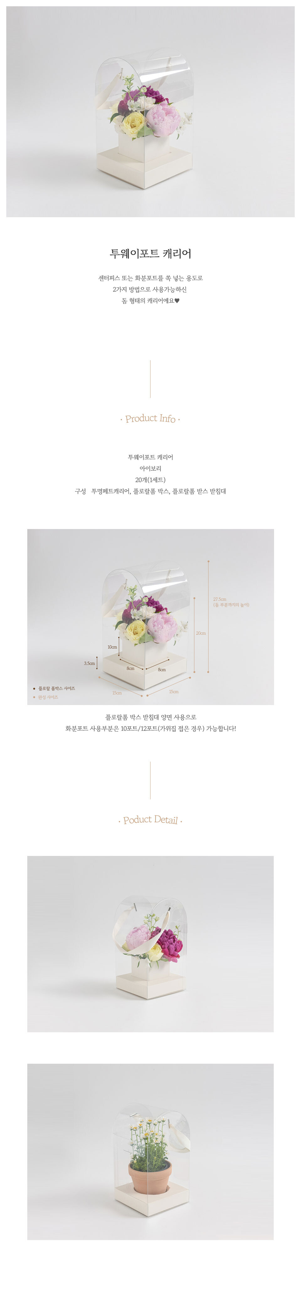 꽃의 색감이 그대로 보여 시원해보이는 투명캐리어입니다. 손잡이가 있어 이동 시에 편리하고 선물용으로 좋습니다.